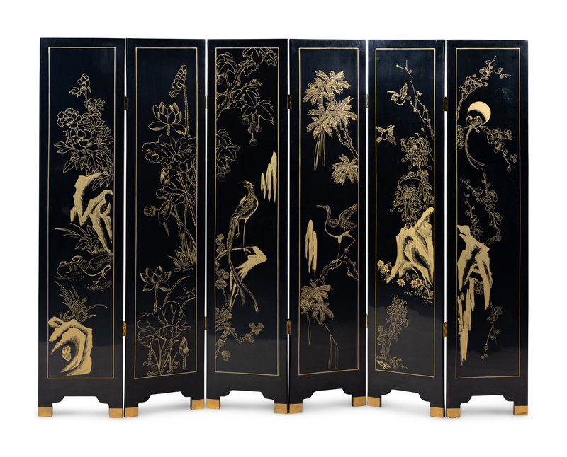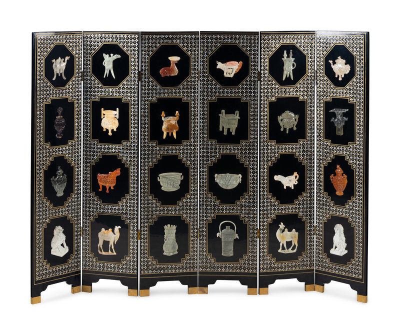 A Chinese Six-Panel Black Lacquered and Hardstone Inlaid Folding Screen
