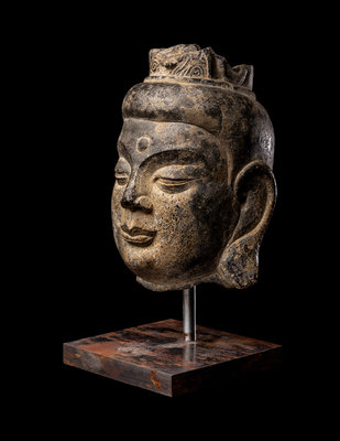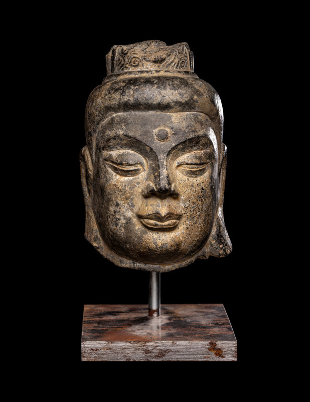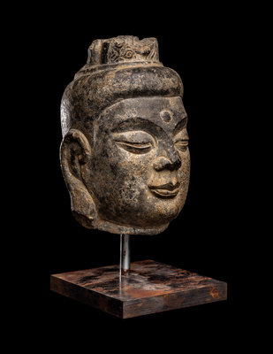 the round face carved with a benevolent expression, the arched eyebrows underneath the urna, above a pair of downcast eyes, an aquiline nose and full lips, flanked by a pair of elongate earlobes, wearing an elaborate crown.