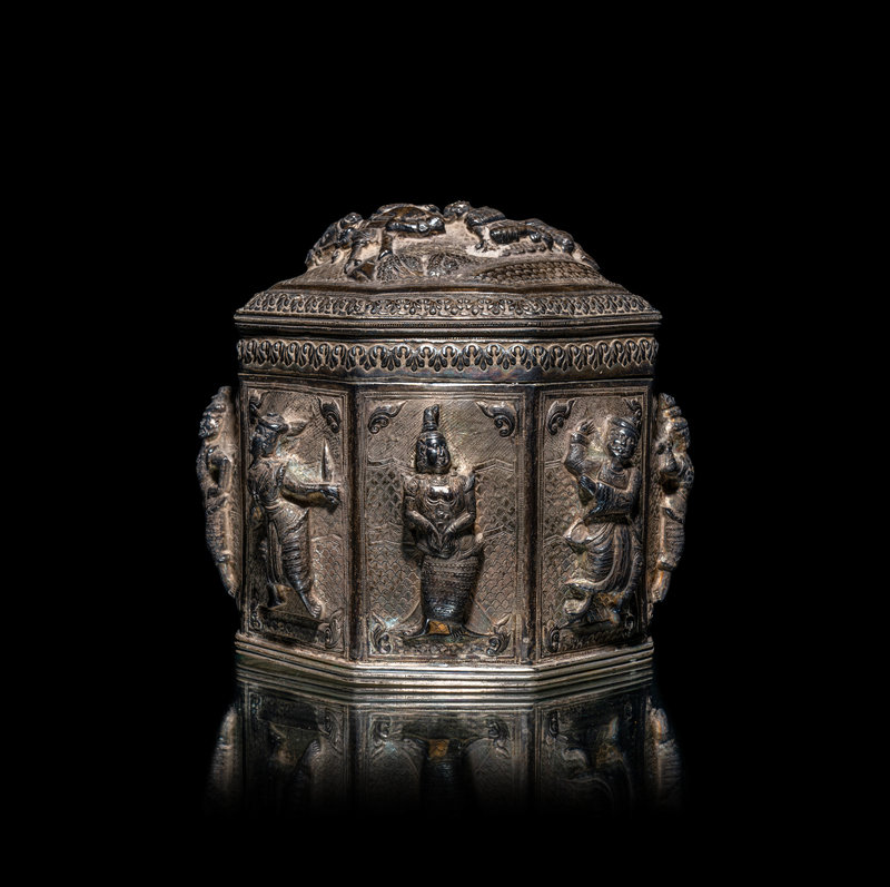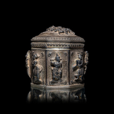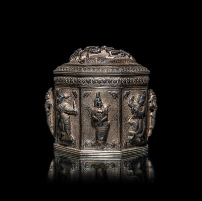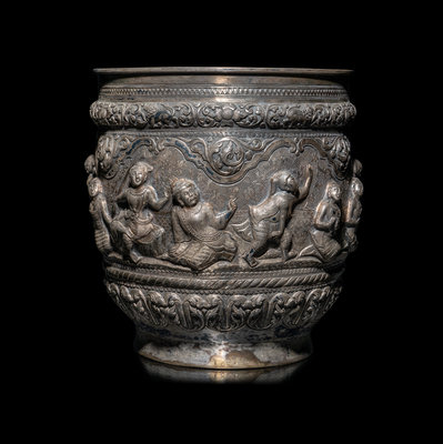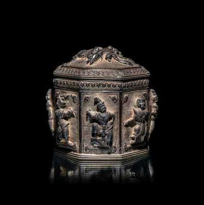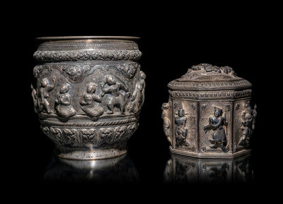 the first a larger example with a rounded body, the second a faceted example with a cover, each chased with various figures.