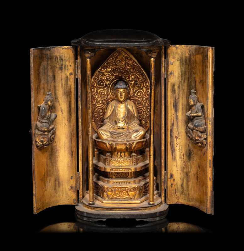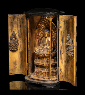 A Japanese Gilt and Black Lacquered Wood Buddhist Shrine with a Figure of a Seated Buddha