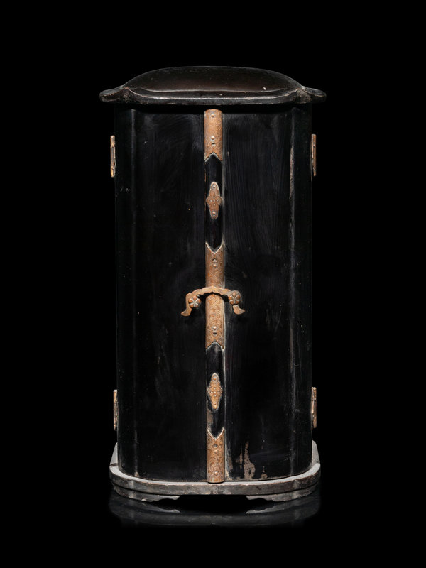 the rectangular shrine having a pair of pull-out doors opening to a seated Buddha in dhyanasana on a stepped throne.