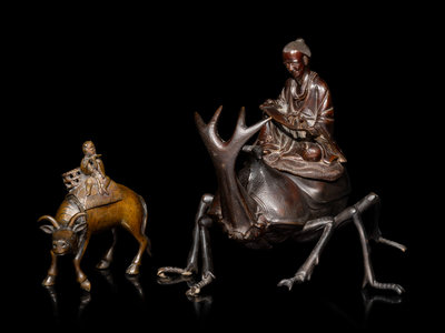 the larger example depicting an immortal riding on a large beetle, the smaller example cast to show a boy sitting atop a donkey.