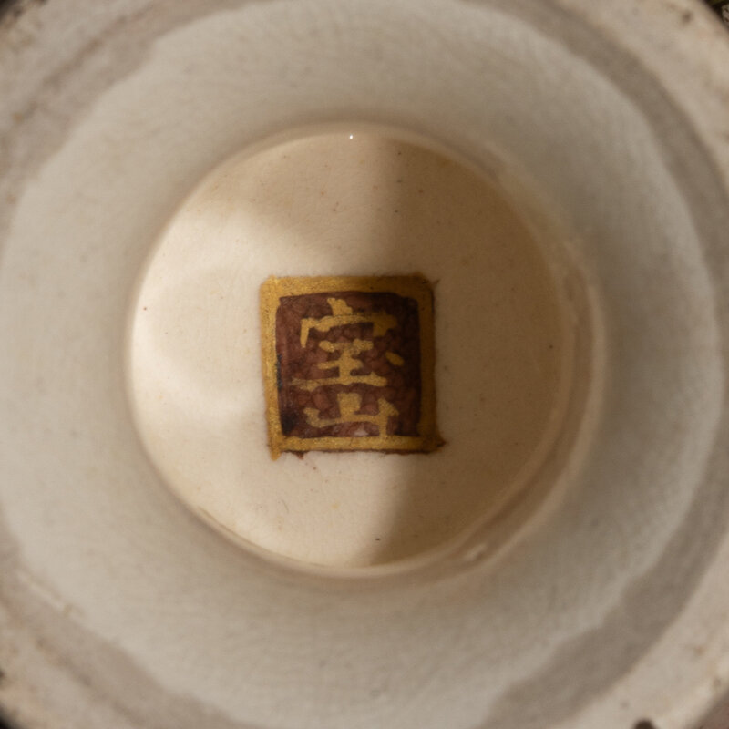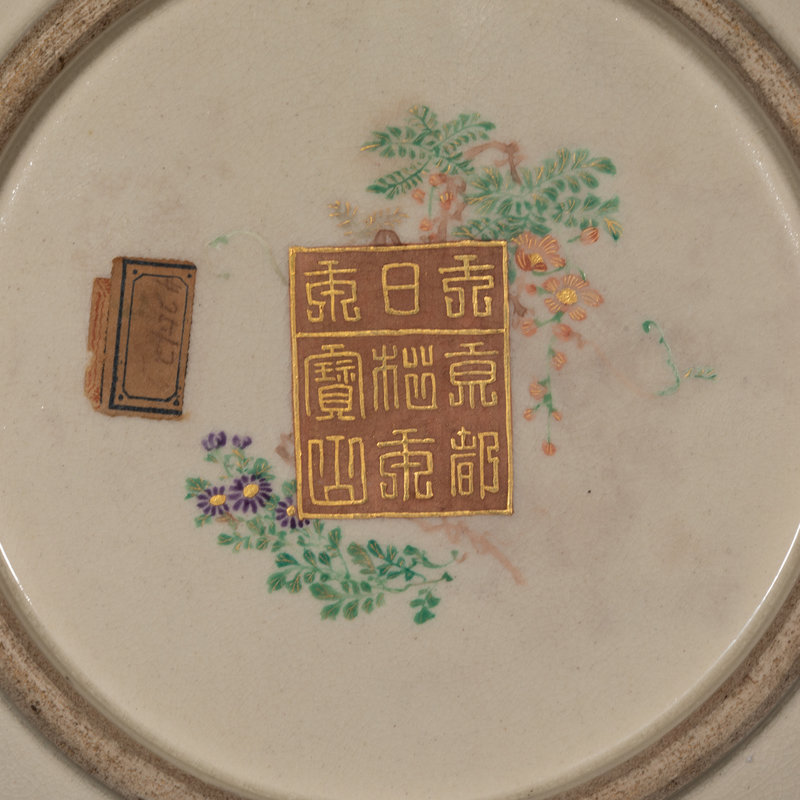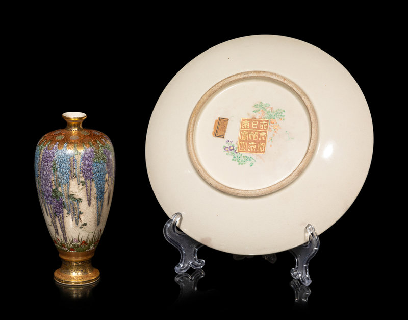 the first a small vase decorated overall with flowering wisteria, the underside signed Hozan, the second a circular plate with the center painted to show a samurai in a mountain scene, the underside bearing a gilt highlighted mark, Dainippon Kyoto Matsumoto Hozan.