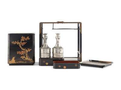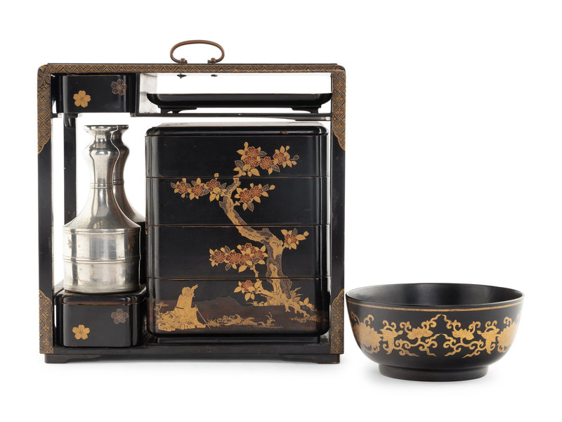 of rectangular form, the outer case fitted with a four-tier stacking box, two sake bottles and a rectangular tray, all decorated with cherry blossoms on a black ground, together with a bowl.