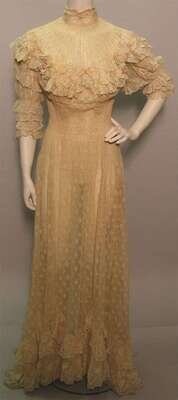Cream tatted lace with a high neck with pin-tucked yoke and applied lace rosettes and additional lace appliqué and ruffling; a fitted smocked waist, flounced and ruffled elbow-length sleeves and a full cascading skirt with two rows of ruffles at the hem, with a short train at the back. Hook-and-eye closures at back, unlabeled.