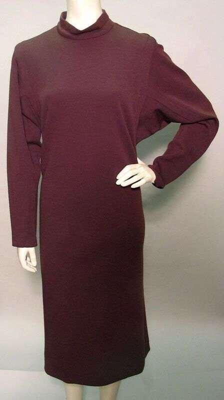 Cream wool jersey with welt pockets and long sleeves with zip cuffs, calf length, labeled "Norman Norell"; and two others identical style in wool jersey with bat-wing sleeves and a short mock turtleneck, back zip, one brown and one navy blue (unlabeled).
