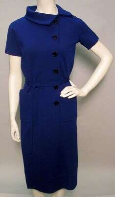 One in black silk with a three-button placket and pussycat bow at neck, bat-wing sleeves and patch pockets at hips, labeled "Norman Norell" and "Lacledes." The other in royal blue wool jersey with short sleeves, off-to-the-side black buttons, patch pockets at hips and attached fabric belt, labeled "Norman Norell."