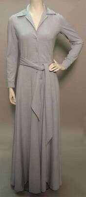 The first a sky blue heather wool shirtwaist with a self-belt and full A-line skirt; the other in melon ultrasuede, collarless shirtwaist, self-belt, abalone buttons and on-seam pockets.