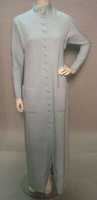 One in beige heather wool with full sleeves and buttoned cuffs, labeled "Norell II by Tassel"; the other in aqua heather jersey knit with patch pockets and fabric-covered buttons, labeled "Norman Norell / New York."