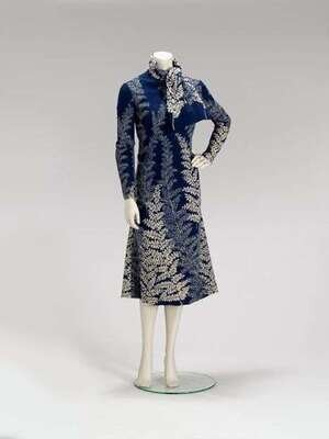 The first in a silk abstract jungle print (blue and green on a black background) with a high pleated scoop neckline, natural waist and long sleeves with rhinestone-button cuffs; the other a wool and mohair woven cyan and white naturalistic foliate print shift with a matching necktie.