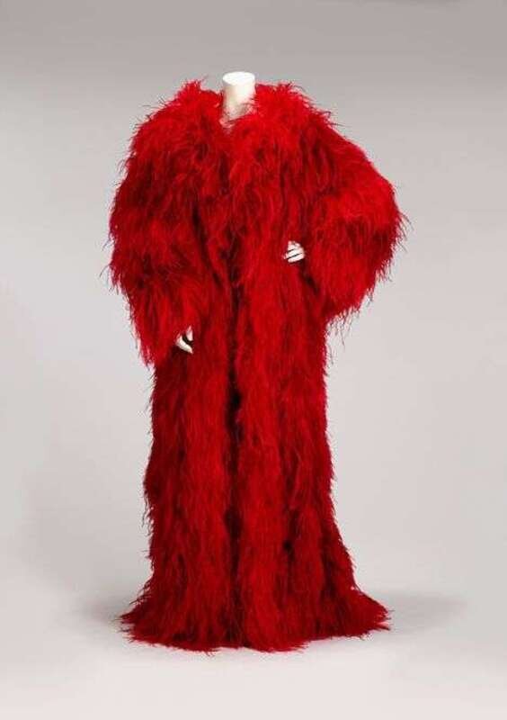 Exuberant fire-engine red ostrich feather coat with long sleeves and a train, no closures, lined in red satin. Labeled "Jean-Louis" and "Lacledes / Memphis."