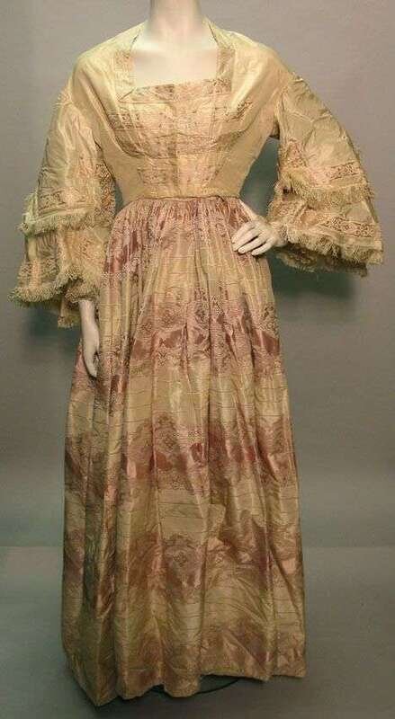 Circa 1840s cream silk with full sleeves with tiered fringed layers, hook-and-eye front-closure bodice, full skirt.