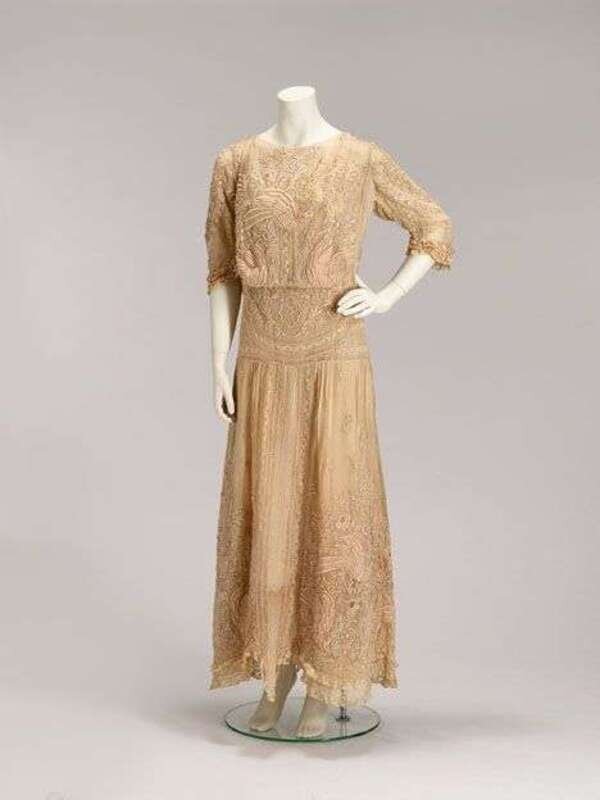 Probably English, with elaborate naturalistic stumpwork embroidery with a centralized exotic bird motif, surrounded by stylized flora and fauna. Inset with lace on a cotton pin-tucked voile, lined with fine tulle, ruffled rows of narrow lace at sleeves and hem. With elbow-length sleeves, high broad scoop neck, glass buttons at shoulders and one side, front.