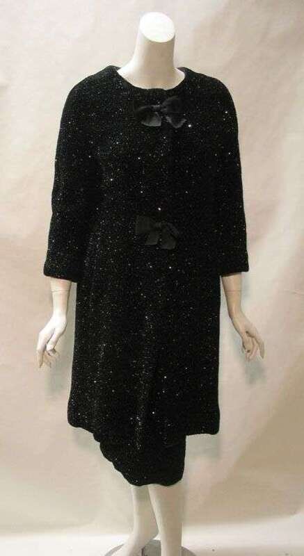 Black chenille tweed flecked with silver, consisting of a long coat with two satin bow details at front and snap closures, silk-lined pockets and also otherwise lined in satin; with a matching pencil skirt with two back zips. Labeled "Philippe Venet Paris" and "2258" hand-written at back of label.