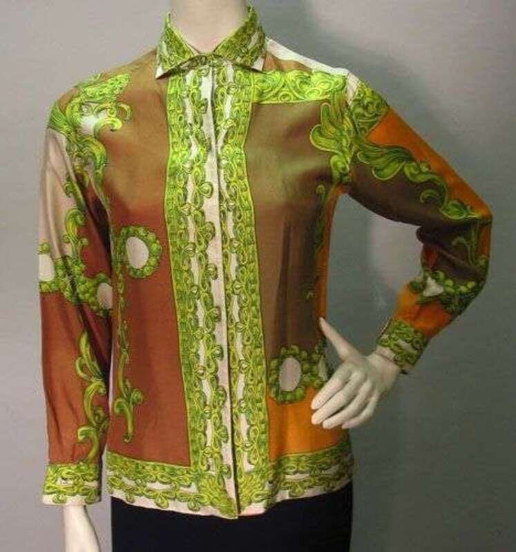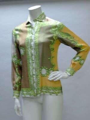 Button-down front and cuffs printed in shades of sable, taupe, yellow, orange and chartreuse.