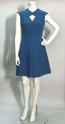 Vibrant teal blue textured crepe above-the-knee dress with diamond-shaped keyhole detail at neck, short capped sleeves and A-line skirt; matching wool jacket with covered button placket and attached tie at the collar.