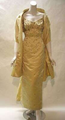 One by Harvey Berin, gold metallic with applied "bow" and floral motif, with embroidery, beading, and rhinestones on tulle; pale yellow full length "wiggle" dress with a train decorated with bead and rhinestone "starbursts," with a matching beaded wrap; and a strapless black lace Flamenco-style fitted dress with off-the-shoulder lace sleeves and asymmetrical exaggerated flounced hem.