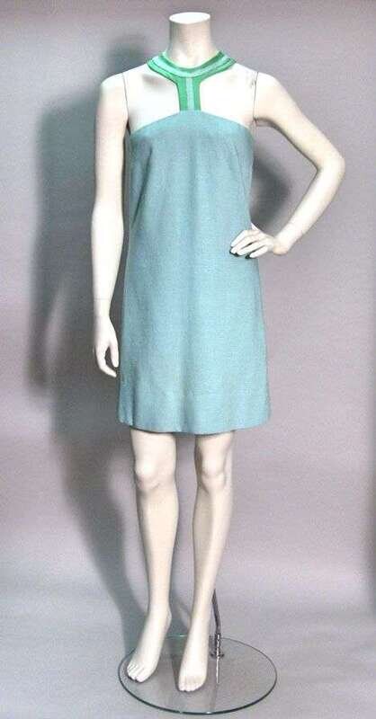 Seafoam green heavy linen sheath with a cut-out T-shaped halter bodice trimed in kelly green. Above-the-knee length.