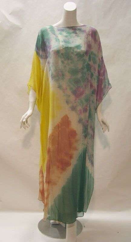 Yellow, emerald, bronze and violet tie-dye pattern on sheer silk, oversized with straight boatneck, rolled edges. With a pale platinum Halston sleeveless jersey dress with a back zip used as a slip.