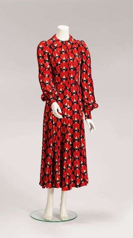 Large red and white ladybugs on a navy ground with an oversized pointed collar, red heart-shaped buttons on a fitted bodice with applied triangular breast pockets, flat waist flaring to a full ankle-length skirt; long sleeves gathered at shoulders and cuffs.