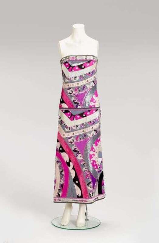 Printed fine silk chiffon, heavily beaded with iridescent sequins, faceted crystal beads, and rhinestones; in shades of shocking pink, violet, cream, grey and black. Full length with light interior boning and side zip, marked on a large black label "EMILIO PUCCI / Firence."