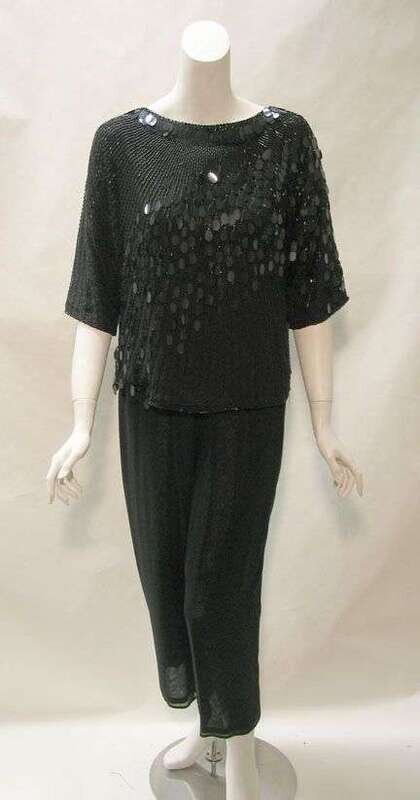 Bat-wing pullover blouse with jet beading and oval paiettes; together with a coordinating pair of Anne Klein rayon pants. Size 6.