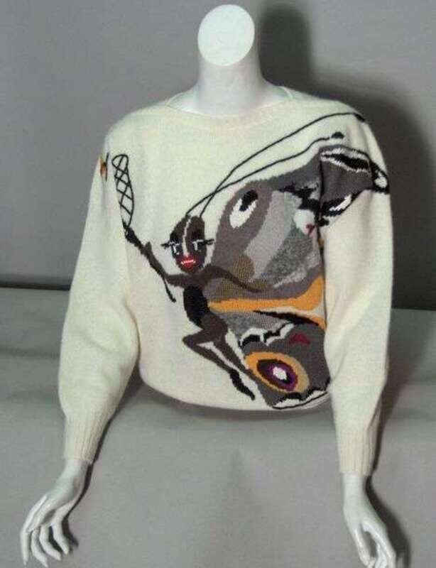 One "fox" motif; one depicting a rhino and a cougar; one of an eagle with its wings spread over the span of the bat-wing sleeves. All in wool and angora, labeled "Krizia Maglia / Made in Italy / At Bergdorf Goodman." The fourth in 90% cashmere with a Magritte-style "bowler hat and necktie" design in grey, black and white. With a fifth of similar style by Mariuccia Mandelli depicting a butterfly-winged fairy with a butterfly net.