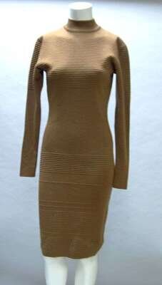 Narrow hourglass silhouette with a knitted-in stripe pattern, metal zipper at back, with a short mock turtle collar, falling to below the knee. Size medium, Italy.