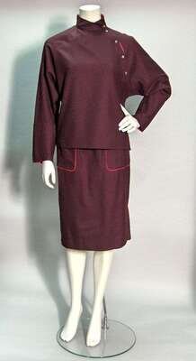 Bordeau with bright red accents, the skirt with stylized geometric pockets and a high fitted waist; the boxy top with raglan-set sleeves and diagonal button placket across the shoulder, short mock-turtleneck.
