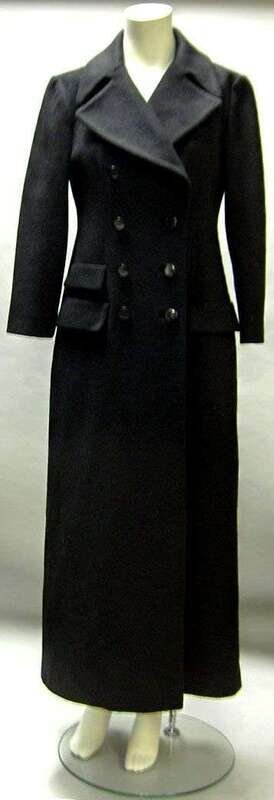 Full-length wide-collared military-style heavy felted wool, closed pleat at back with black disk buttons. Labeled "Saint Laurent / Rive Gauche / Made in France."