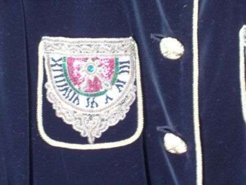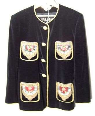 Collarless with four beaded and decorated pockets in a "clock" motif, with four large gold metal buttons and gold piping on all edges.