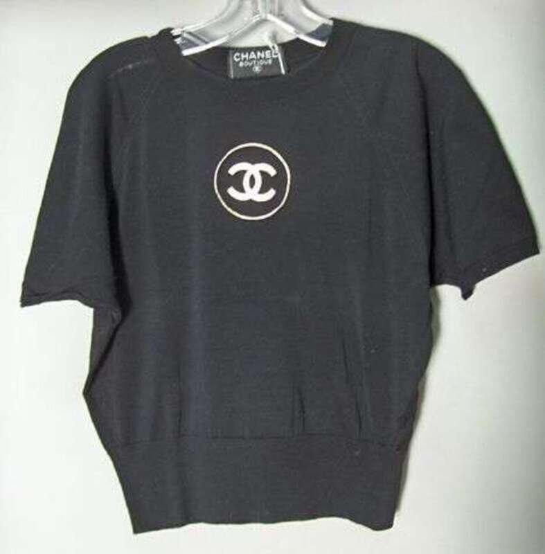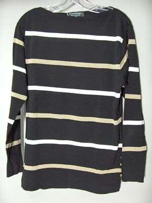 Black long sleeve with boatneck and beige and white stripes with gold buttons at cuffs; white short sleeve pointelle; black long raglan-set sleeves with gold buttons at the back of the neck; white short sleeve bat-wing with embroidered logo at front; pink elbow-length sleeve crew neck with embroidered logo; white short sleeve with navy stripes and navy embroidered logo; black short raglan-set sleeves with gold-stamped logo at front.