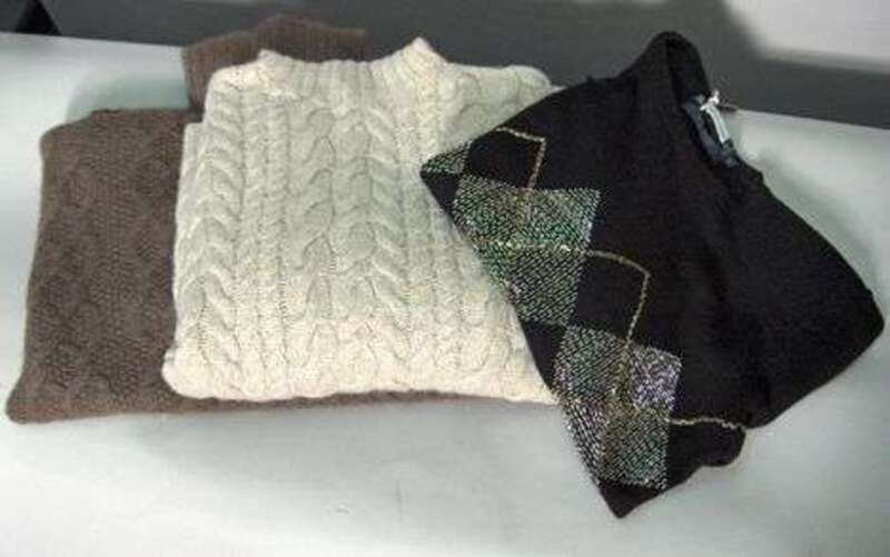 One brown cable turtleneck by TSE; one cream heather cable turtleneck by Saks Fifth Ave.; one black crew neck by Ralph Lauren with argyle beading across the center.