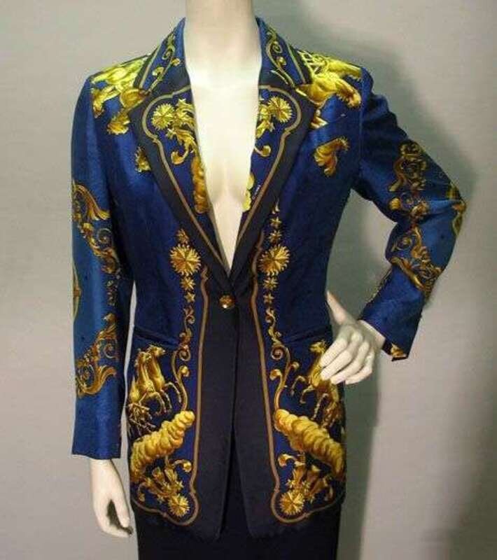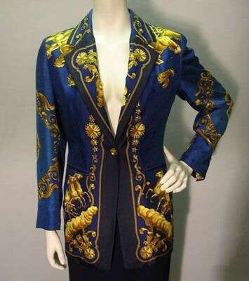 Classic single-breasted blazer with a one-button closure in an all-over scarf-print in cobalt blue and gold, depicting Italianate architectural decorative celestial and mythical motifs.