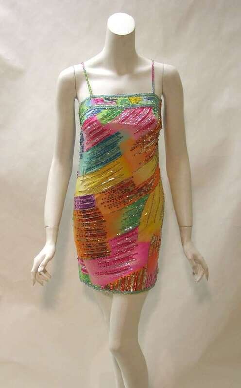 Spaghetti straps on a short fitted stretch jersey multicolored "brush-stroke" print covered in beads and sequins, with a side zip.