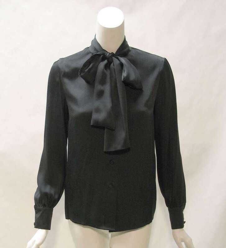 Covered buttons and classic styling, with a wide and long self-tie at the neck. Labeled "Chanel Creations / Made in France," approximately size 6.