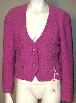 Bright pink-violet boucle tweed with a deep V-neckline and two-button closure, four patch envelope-shaped pockets, slightly cropped length.