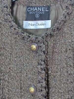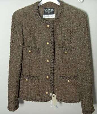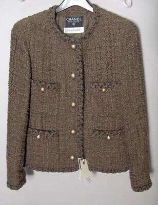 Chocolate brown nubby tweed with five gold logo buttons and four front patch pockets; lined in silk with a weighted hem.