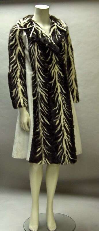 Mahogany and white mink forming a zebra-like chevron pattern; double-breasted, notch collar, with white leather sides and inset at the arms.