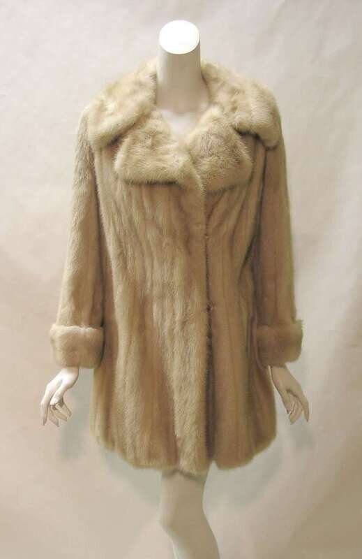 Mid-length with notch collar and cuffed sleeves, vertically worked skins, hidden hook closures.