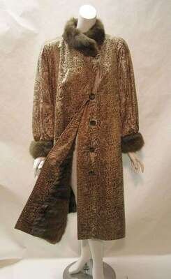 Brown satin snake-print embossed nylon calf-length coat with the body lined in golden ermine fur, with ermine cuffs and collar.
