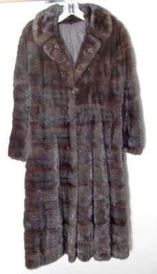 Classic notch collar hidden closure A-line coat with horizontal skins, slim arms and nipped waist; labeled in one inside pocket with Maximilian custom-order tag, but otherwise without labels.