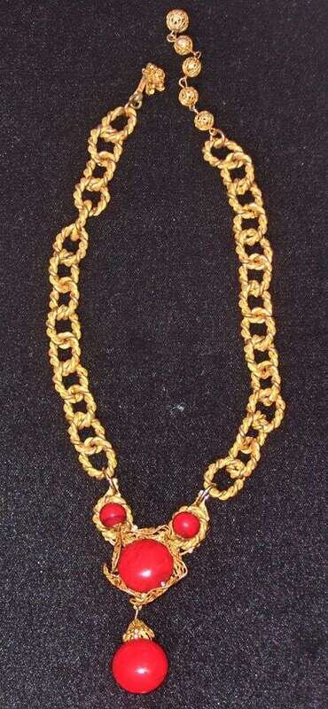 Consisting of a gold textured chain and red glass necklace signed Miriam Haskell; a pressed amber glass necklace; a sweater clip with gold flowers with opalescent bead centers and molded purple glass leaf-shaped drops, possibly Miriam Haskell (unsigned); and two Haskell-style floral and pearl-cluster and beaded multi-strand sweater clips in need of restoration.