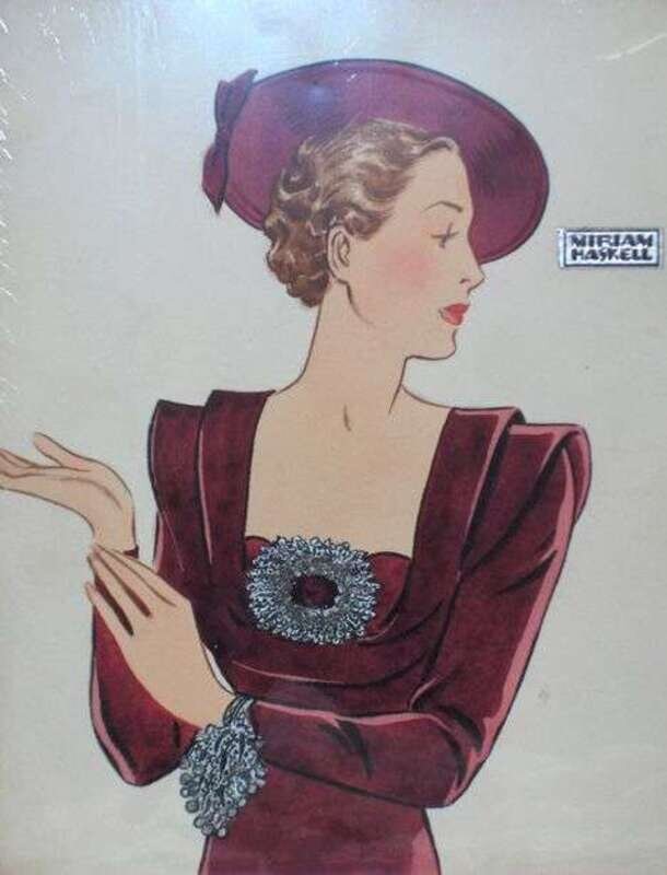 Gouache on illustration board depicting a lady in a cranberry dress and matching hat, with a large oval gunmetal brooch and matching cluster bracelet, both with added metallic glitter. Marked "445" on back in ink.