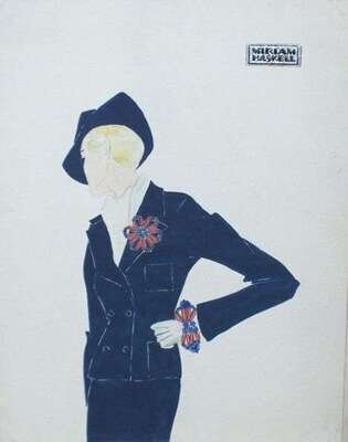 Gouache on illustration board, depicting a blond lady in a navy suit and matching hat with a large red and blue beaded floral brooch on her lapel with a matching bracelet. Marked "632" in pencil, verso.