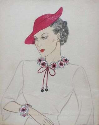 Gouache on illustration board depicting a lady in a red hat and white dress wearing a floral collar tie-front necklace and a matching bracelet.