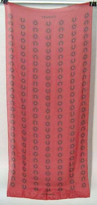 One red chiffon with black "COCO" design; small chiffon multicolor "double-C" logo at center; red and cream with geometric pattern at either end, diagonally terminated.