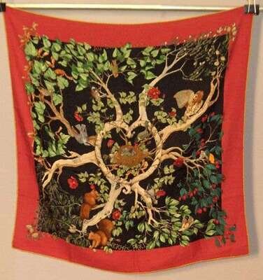 Wool herringbone twill printed with birds and woodland creatures in a naturalistic setting.
