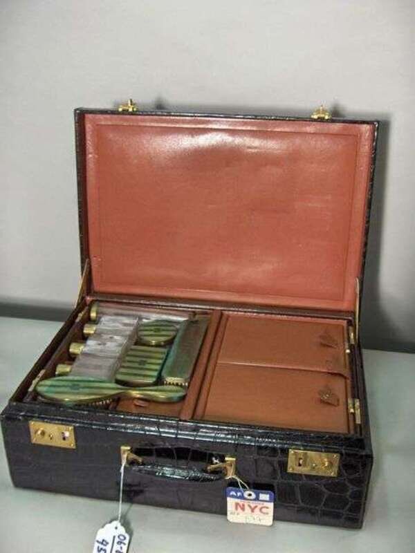 Lined in embossed leather with brass hardware, fitted with a full cut-leaded glass toiletry kit and a manicure set contained within a tray which can be removed and folded into a separate suitcase-shaped box. Unmarked, with keys.