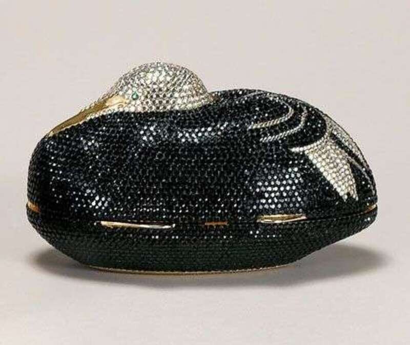 Designed as a resting gull, with a black crystal body and silver head and wing details, with gold accents and green eyes; lined in gold kid.